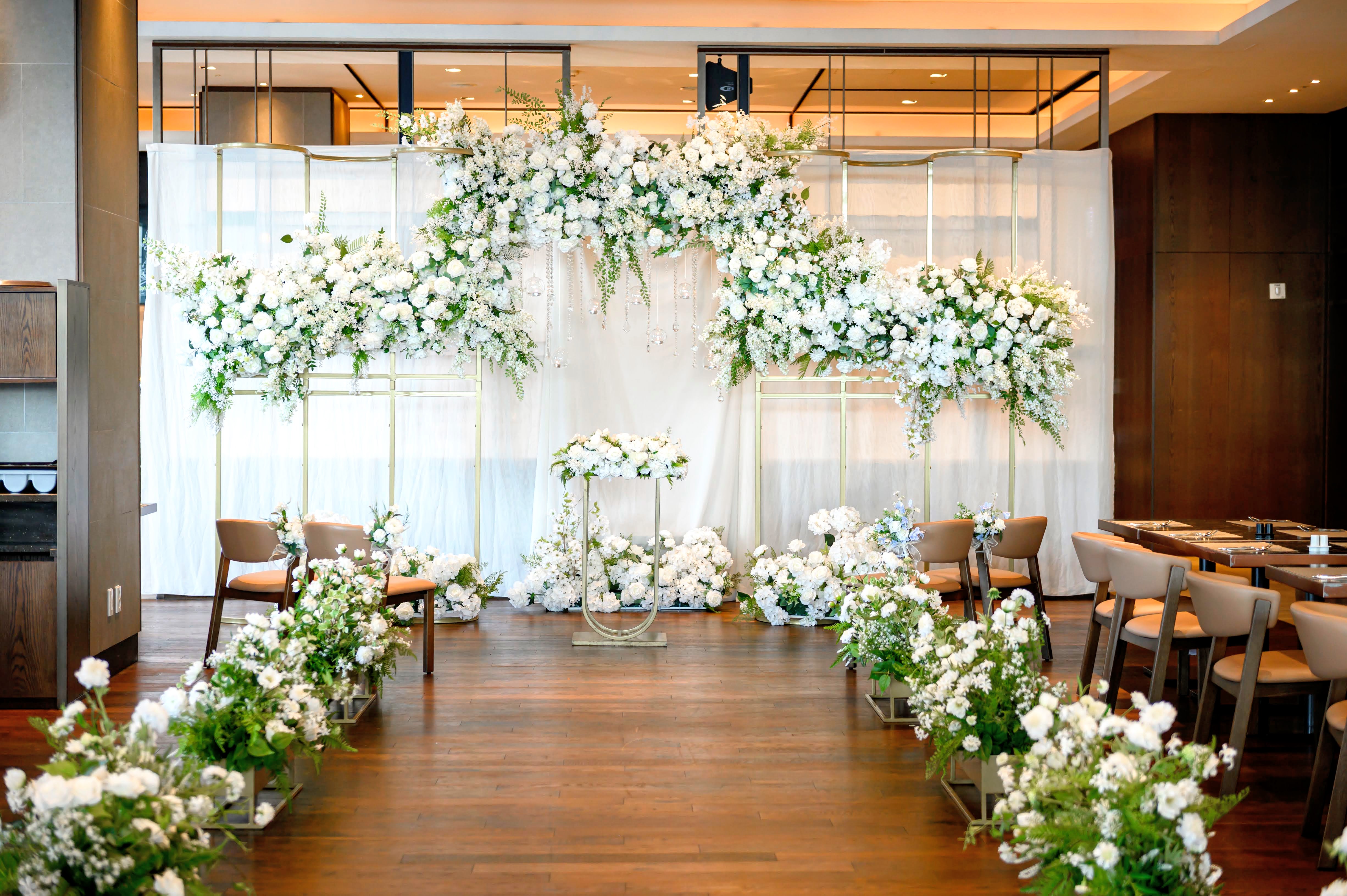 예식의 성스러움을 상징하는 듯 그린&화이트 컨셉의 플라워아치 는, 서울역점 인테리어와 가장 잘 어울리는 인기 있는 조합입니다. 오직 마리앤코 서울역점만을 위해 특수 제작한 가로 3.5M, 높이 2.6M 크기로 스몰웨딩에선 쉽게 볼 수 없는 스케일을 자랑합니다.